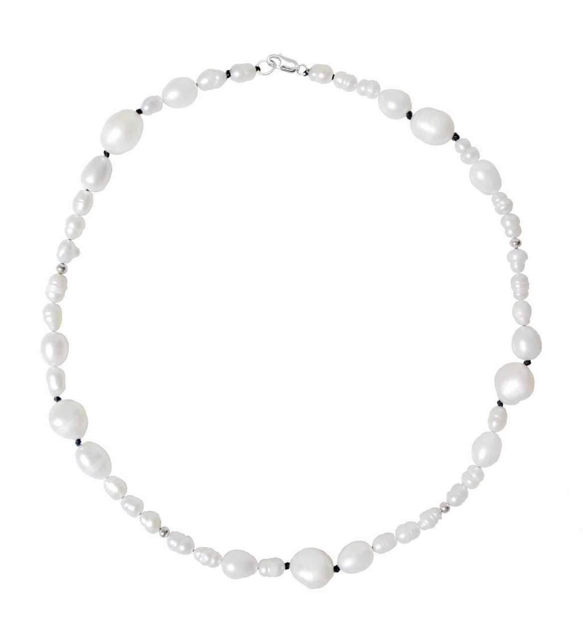 Колье из барочных жемчужин разных форм и размеров со вставками серебристых шариков и красных узлов. Новое нескучное прочтение классики.